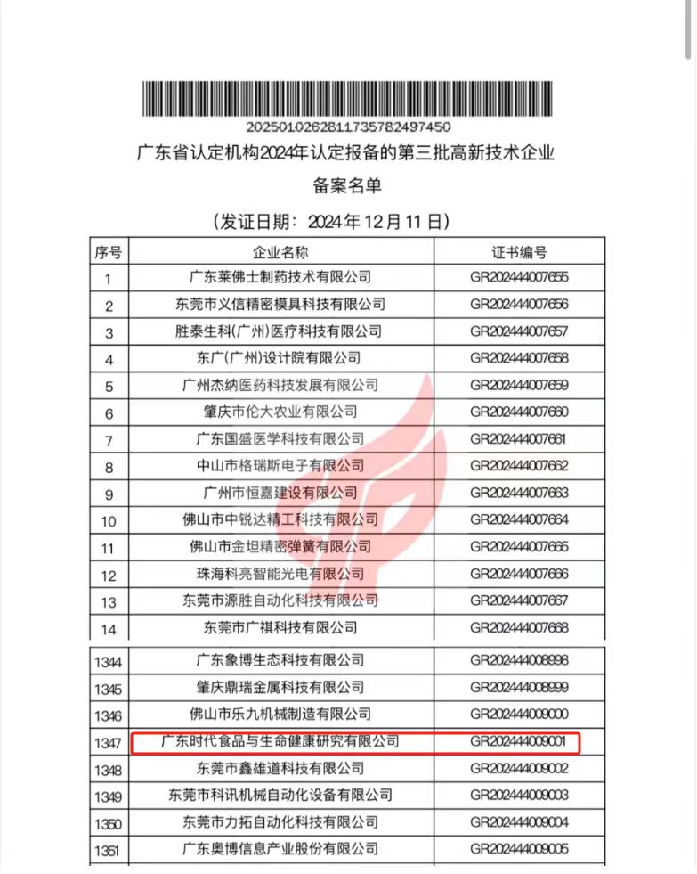 近日,广东好普集团旗下广东时代食品与生命健康研究有限公司再次荣获由广东省科学技术厅、广东省财政厅、国家税务总局广东省税务局联合颁发的高新技术企业证书。好普集团再次获得此项殊荣不仅彰显了公司在高新技术领域的卓越成就,也进一步充分证明了企业的创新能力。
