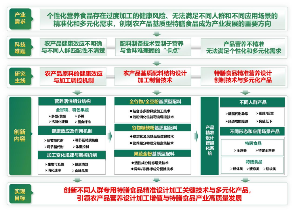 面对传统营养食品行业长期面临的痛点,产业呼唤一场以科技为驱动的深刻变革。直面产业瓶颈,时代生物研究中心以敏锐的产业洞察力,前瞻性地确立了“回归农产品基质,创制精准特膳”的研发路径。项目不再局限于单一成分的提取与强化,而是创新性地以全谷物、特色果蔬等天然农产品为基质,致力于系统解决“健康效应不明确、营养设计不精准、加工技术与食味难以兼顾”等三大科技难题。