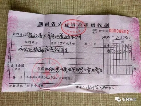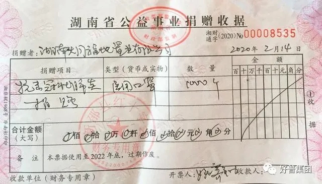 2月4日,好普集团旗下养生地产湖南大同福地置业公司捐赠一次性医用口罩10000个。