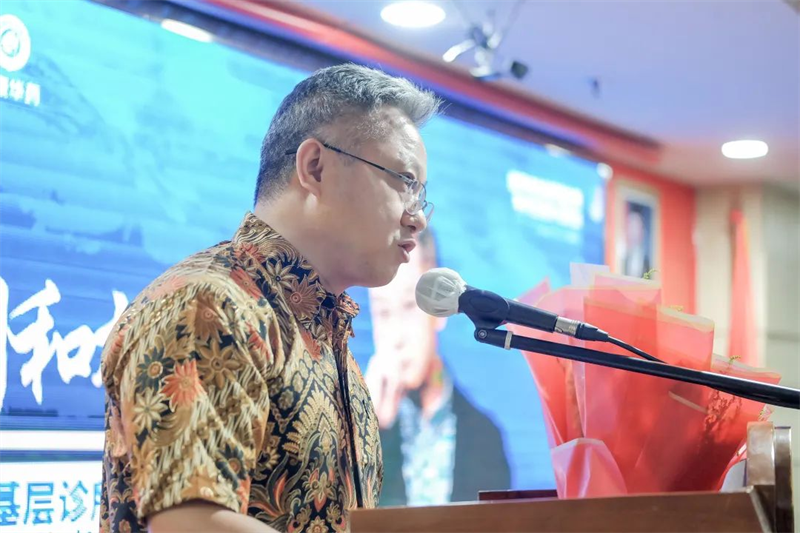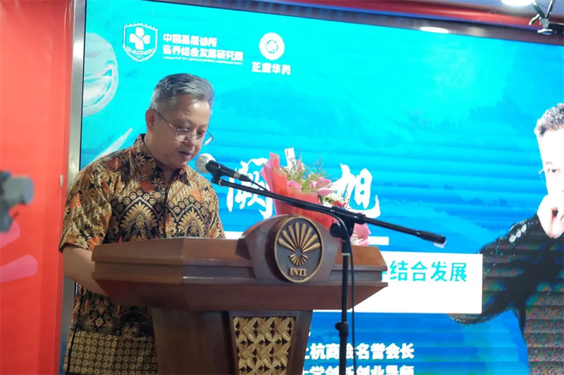 中国基层诊所医养结合发展研究院秘书长兼正康华药总裁阙和旭致辞:"医养结合是中国千年中医“治未病”的智慧传承,已成为全球健康领域的重要趋势,我们在中国已经帮助了成千上万家基层诊所,成功探索出了医养结合的模式,并帮助患者缩短病程,实现医患共赢,助力基层诊所实现可持续发展,在座的华侨医生都是中医文化传播者,我们应当携手共进,提高医养结合服务水平,为印尼人民的健康福祉贡献我们的力量。”