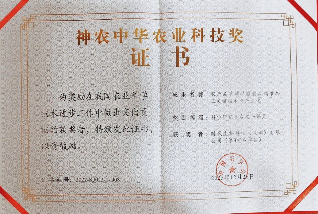 近日,2022-2023年度神农中华农业科技奖表彰证书正式颁发,由时代生物科技(深圳)有限公司(简称“时代生物”)参与完成的“农产品基质特膳食品精准加工关键技术与产业化”成果,凭借农业科技转化与健康产业赋能领域的突出贡献,荣获神农中华农业科技奖一等奖,彰显顶尖技术水平与产业化价值!