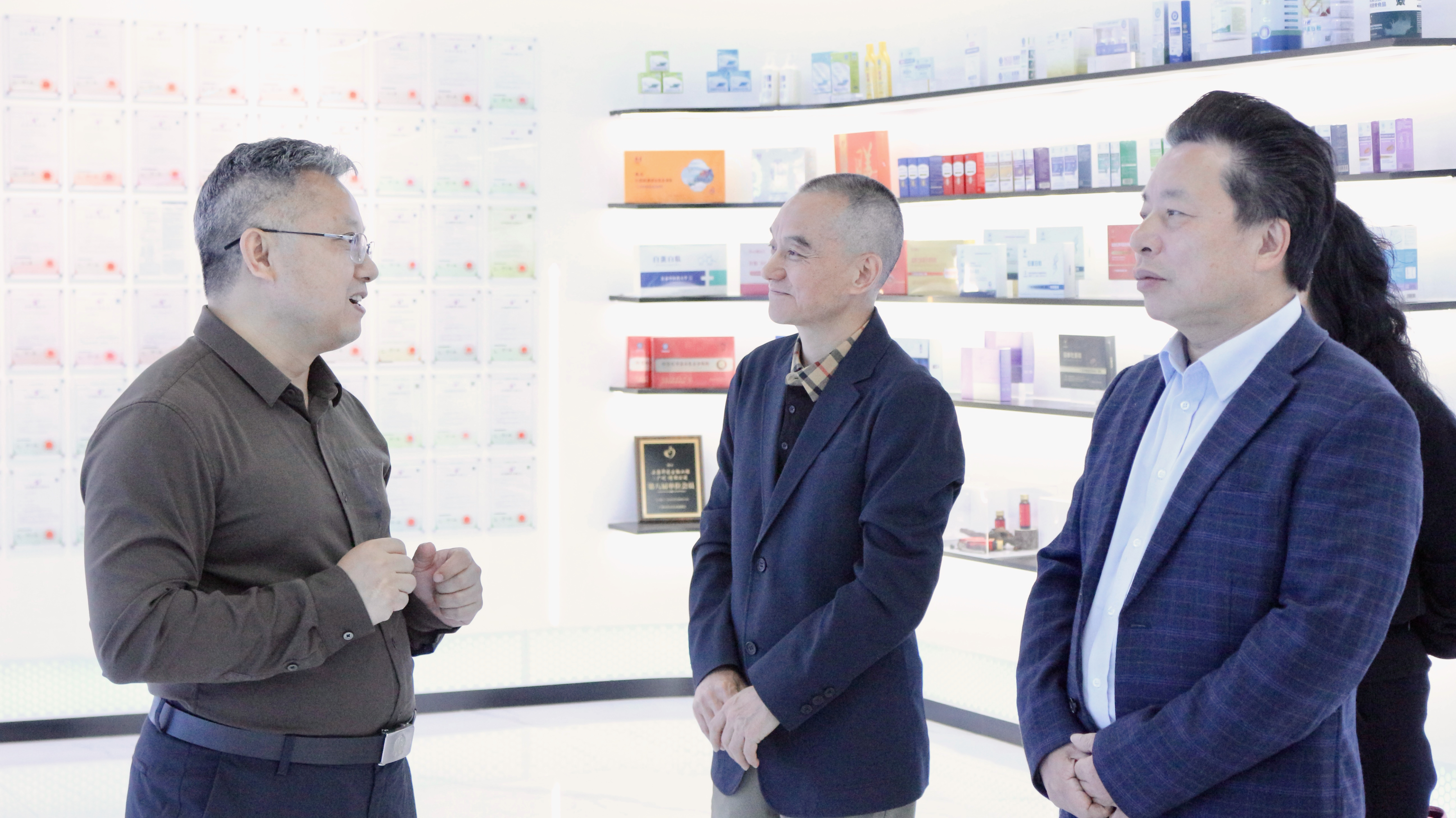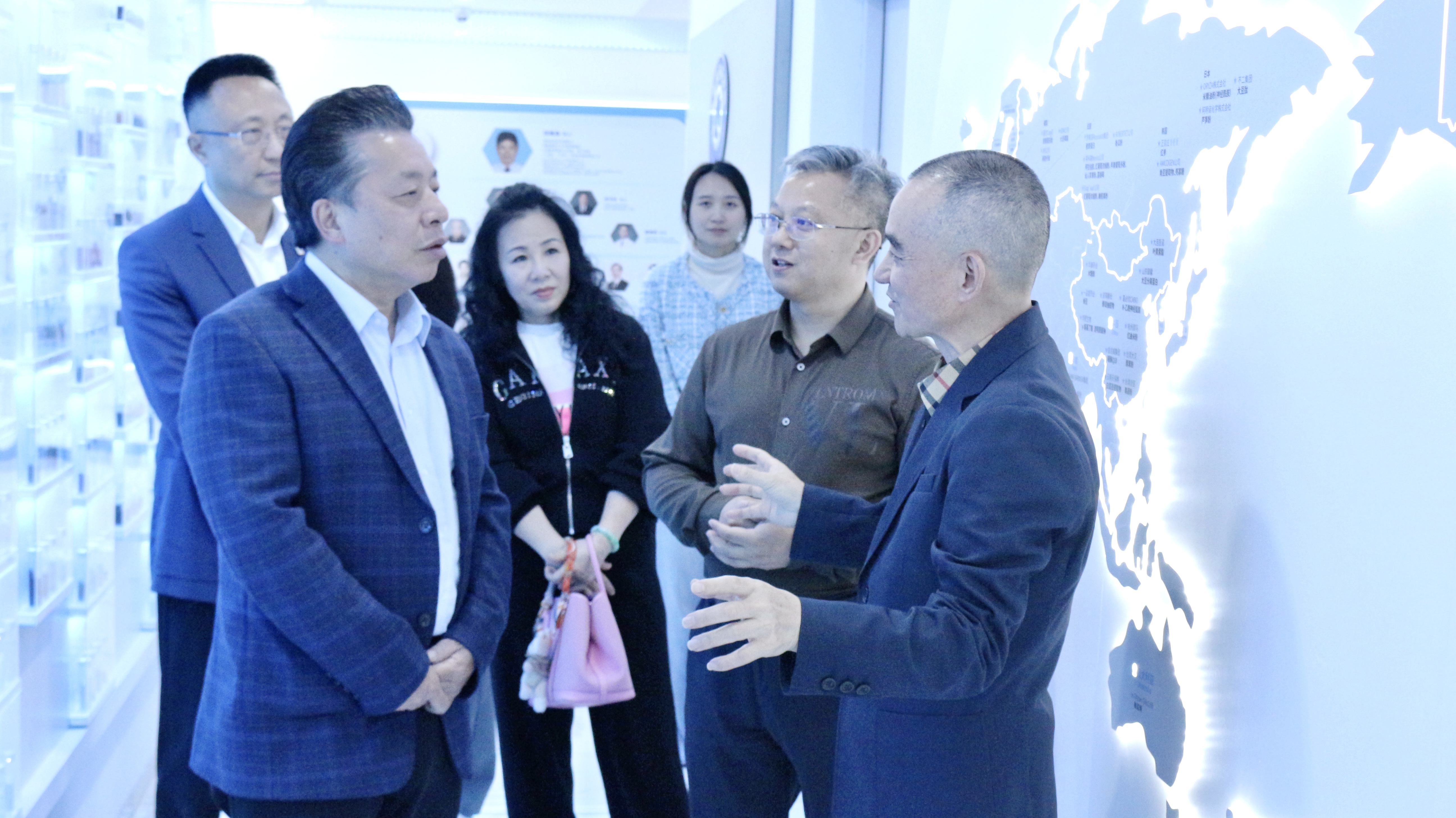随后,一行人前往好普集团十楼企业文化展示区域,深入了解企业的发展理念、核心布局及科研实力。正康华药总裁阙和旭全程讲解,详细介绍了企业的职能定位、研究方向,以及好普集团在深耕健康领域、践行“服务大众健康,推动社会进步”理念过程中,如何将企业理念与发展实践深度融合,打造兼具温度与力量的企业发展体系,展现了企业在深耕实业、传承优良理念、服务社会中的初心与坚守。