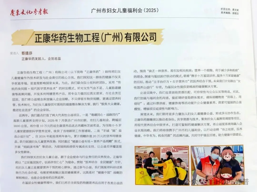 此次活动中,好普集团旗下正康华药的公益实践与爱心举措得到了权威媒体的专项认可,成功荣登《广东文化参考报》“广州市妇女儿童福利会(2025)专版”,成为专题聚焦报道的重点爱心企业。这份来自权威媒体的肯定,不仅是对正康华药过往公益之路的认可,更是对企业持续深耕公益、传递大爱的有力鼓舞,也让正康的医养公益理念被更多人看见、传递。